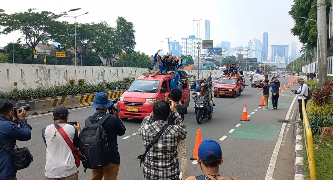 Ada yang berjalan kaki dan menggunakan angkutan kota (angkot) ke titik lokasi demonstrasi.
