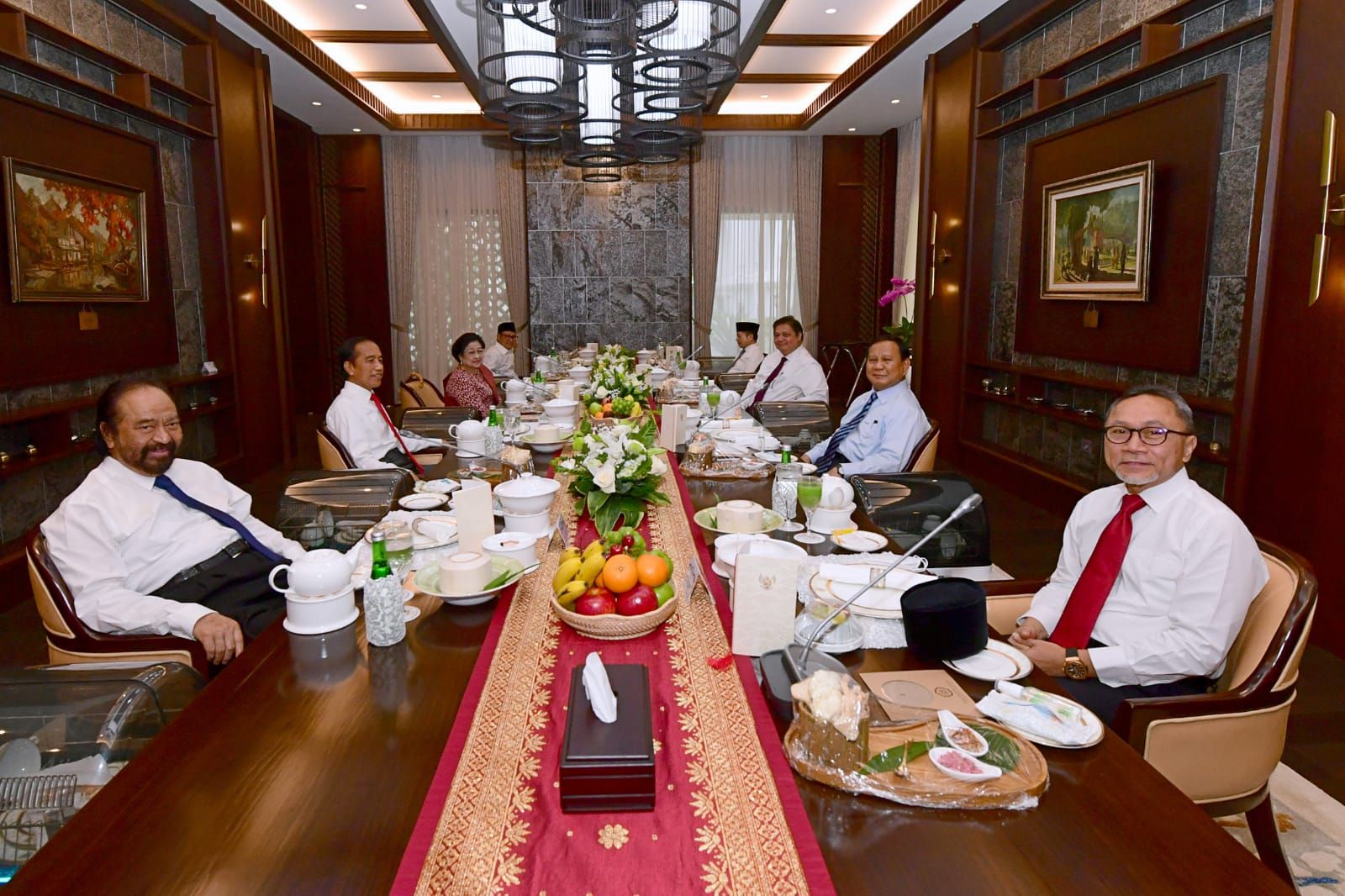 Tampak hadir Ketua Umum PDIP Megawati Soekarnoputri, Ketua Umum Partai Gerindra Prabowo Subianto, Ketua Umum Partai Golkar Airlangga HartartoKetua Umum Partai Nasdem Surya Paloh, Ketua Umum PPP Suharso Monoarfa, Ketua Umum PAN Zulkifli Hasan dan Ketua Umum PKB Muhaimin Iskandar.