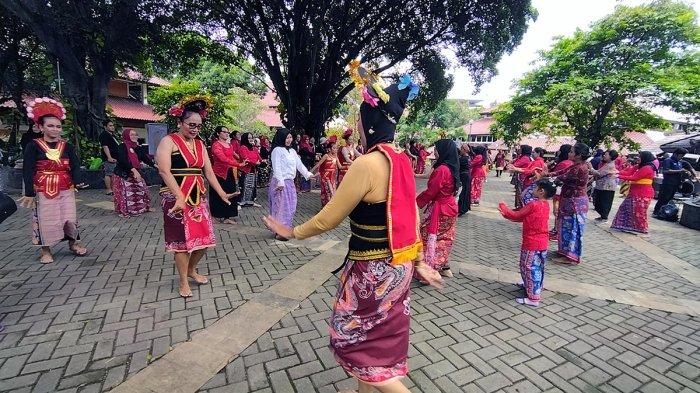 TRIBUNNEWSDEPOK.COM, DEPOK - Komunitas Bareng-Bareng Kumpul Budaya (Bakul Budaya) di Kampus Fakultas Ilmu Pengetahuan Budaya Universitas Indonesia (FIB UI), Kota Depok, Jawa Barat mengadakan pentas kolosal menarikan tari Yapong karya Maestro Bagong Kussudiardja di Pelataran FIB-UI, Kota Depok, Sabtu (8/10/2022).