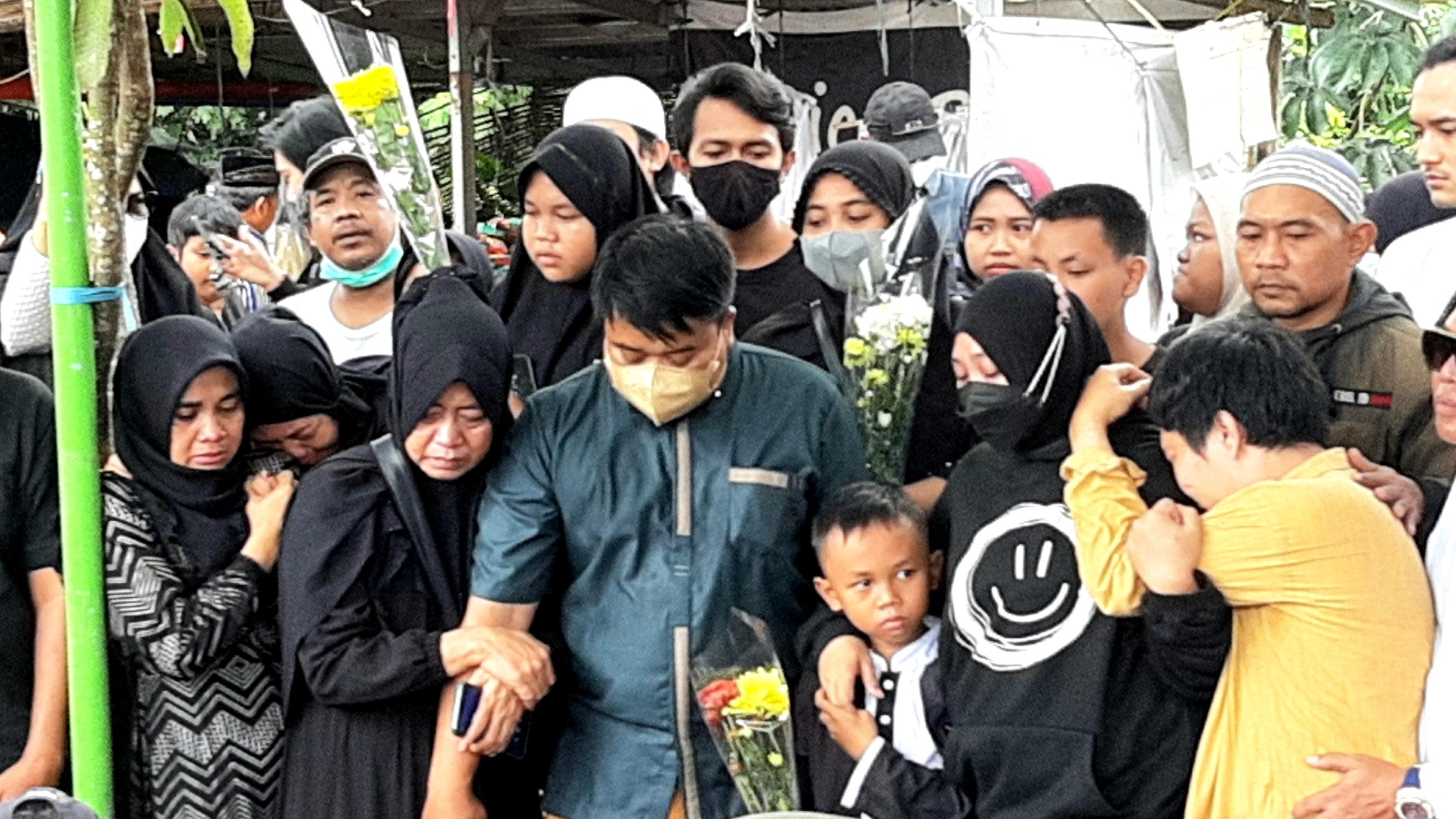 Isak tangis keluarga mewarnai pemakaman Pak Ogah, yang meninggal dunia karena sakit di RS Kartika Husada Jatiasih, Bekasi, Jawa Barat, Rabu (28/12/2022) malam.