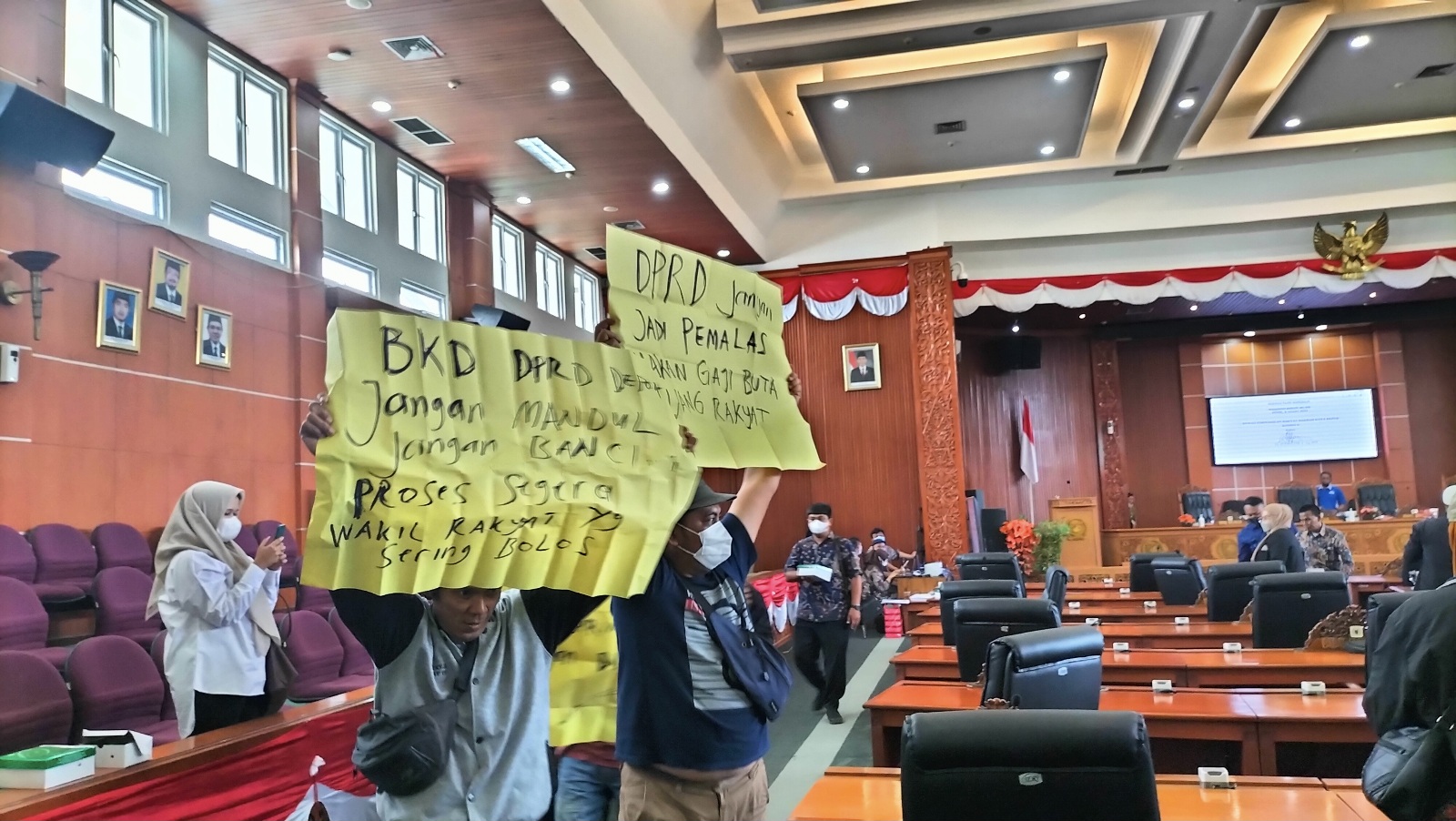 "DPRD jangan jadi pemalas, semua ini memakai uang rakyat," ujar teriakan salah seorang pengunjuk rasa sambil mengangkat karton bertuliskan kekesalan pada anggota DPRD di ruang sidang, Gedung DPRD Kota Depok, Cilodong, Kota Depok, Jawa Barat, Senin (2/1/2023).