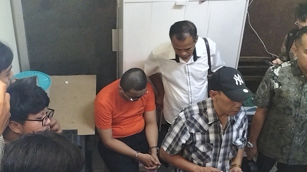Tersangka tampak mengenakan baju tahanan berwarna oranye dengan kedua tangan di borgol.