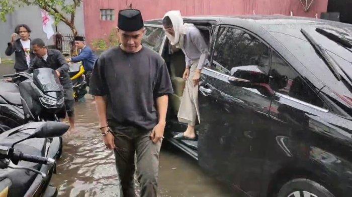 Lantas, putra sulung Presiden Joko Widodo terlihat menyingsingkan celananya untuk menghindari genangan banjir saat turun dari mobil.