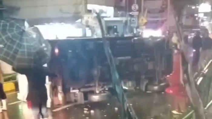 TRIBUNNEWSDEPOK.COM, BEJI - Truk boks terguling di turunan fly over Jalan Arif Rahman Hakim, Kecamatan Beji, Kota Depok, Jawa Barat pada Jumat (2/2/2024) malam sekira pukul 19.50 WIB.