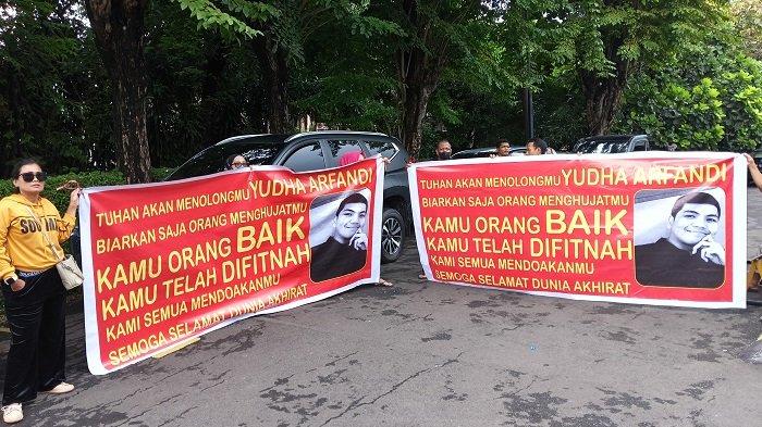 Salah seorang wanita yang memegang spanduk itu mengakui, dirinya adalah perwakilan keluarga Yudha yang datang untuk memberikan dukungan.